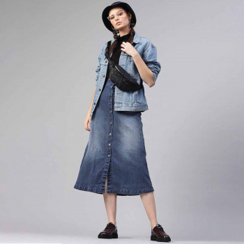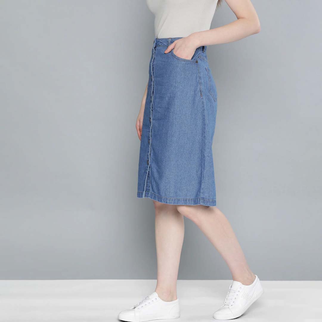 Blue solid denim skirt, has an elasticated waistband with a button closure, straight hem