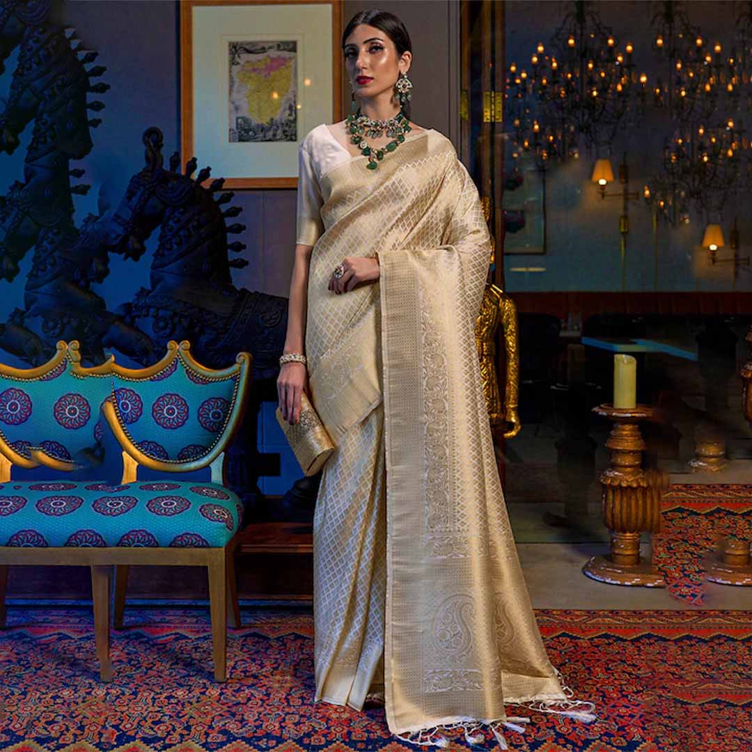 Cream-coloured and gold-toned kanjeevaram saree Ethnic motifs woven design saree with zari border Has zari detail