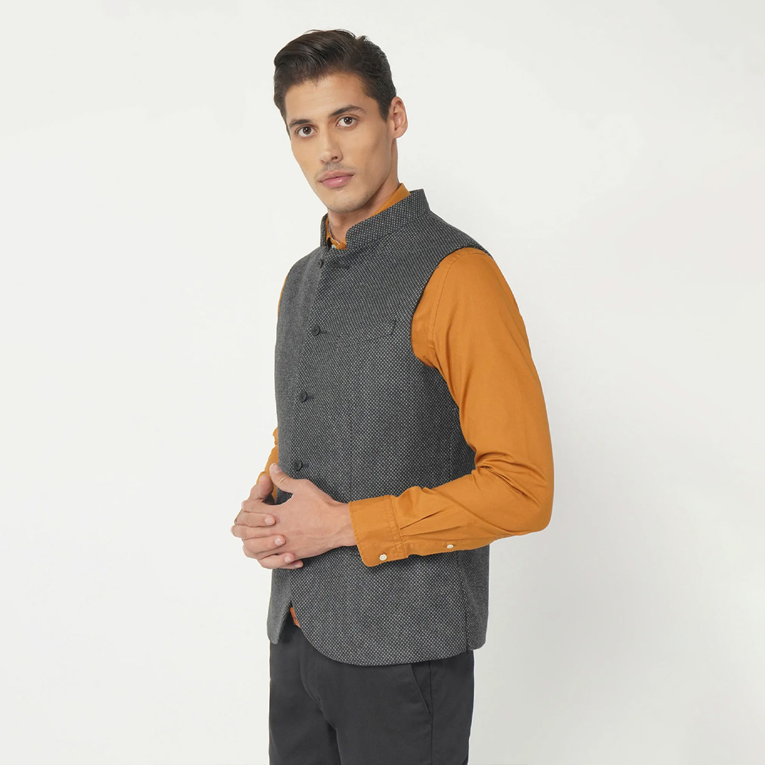Enhance your dressing style with this stylish grey jacket from Blackberry. It is crafted in the finest material, this piece features a mandarin neck, sleeveless, and button fly closure. This piece will go best with trousers and shoes to complement the look.