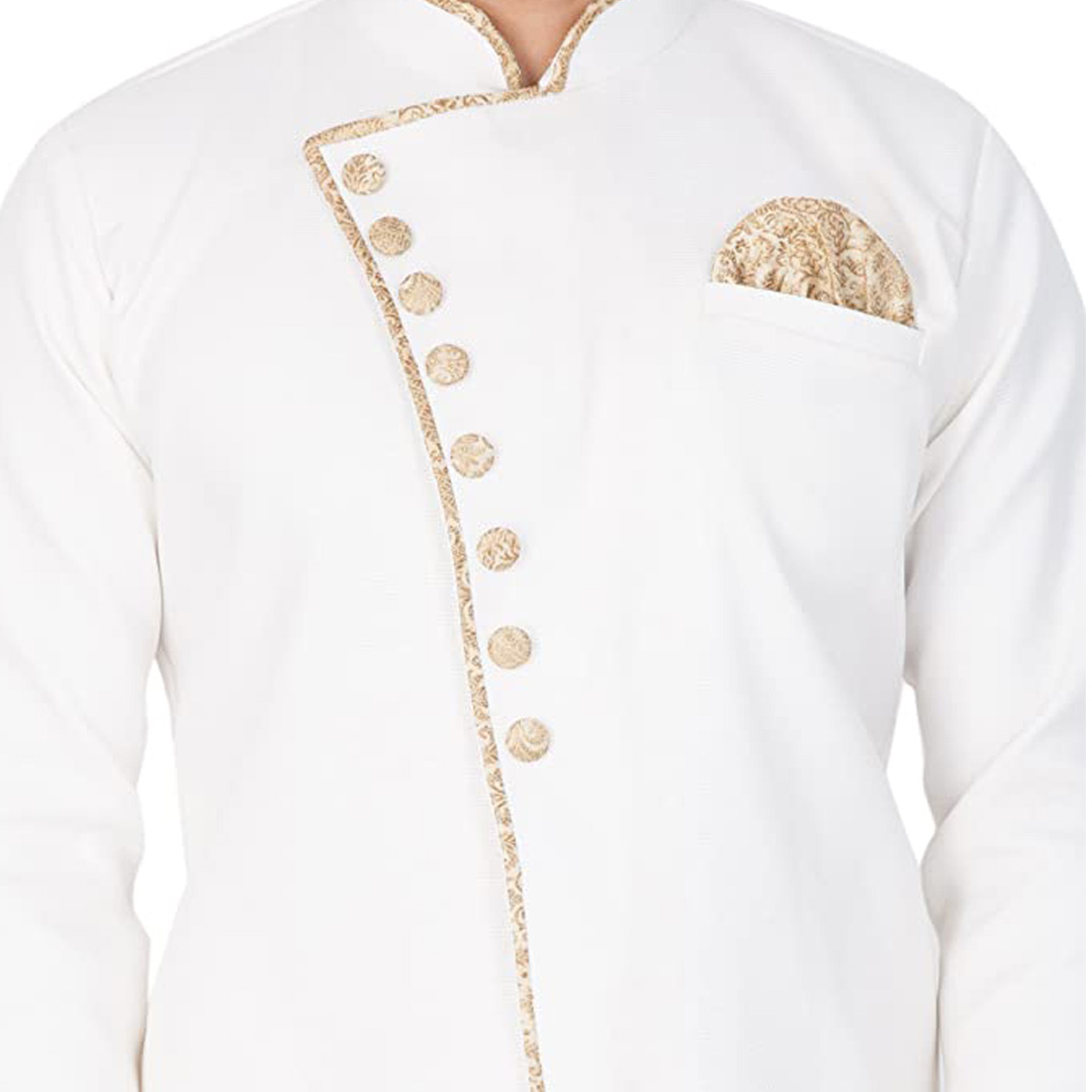 Product Details: We introduces to you these classy sherwani for men stylish latest design in variety of material and designs for all occassions. This fabric has been designed keeping in mind the latest trends in a semi formal fashion or occassional fashion. Engineering garments which fit all body types and style is our aim. We offer not just servani for man for wedding but also indo western for men and semi sherwani as well covering the entire space. Our servani are constructed in such a way that you can adorn it with a churidar, dhoti for men or a patiala too. To complete the look adorn a mojari or jutti slippers for men stylish, you may also try an authentic Kohlapuri chappal for men, the fashionistas and millennial folks may experiment with a brogues or oxfords juta for men stylish. Suitable for: Party, Weddings, Regular Wear, Celebrations, Occasions, Festivals, Lohri, Pongal, Makar Sakranti, Baisakhi, Holi, Eid, Raksha Bandhan, Dussehra, Diwali, Navratri, Pooja, Christmas, Onam, Ganesh Chaturthi, Janmasthmi and Gifts for Mens. SIZE:The above mentioned model is wearing the size of "L" WASH AND CARE: Dry Clean Only FIT TYPE: Regular Fit