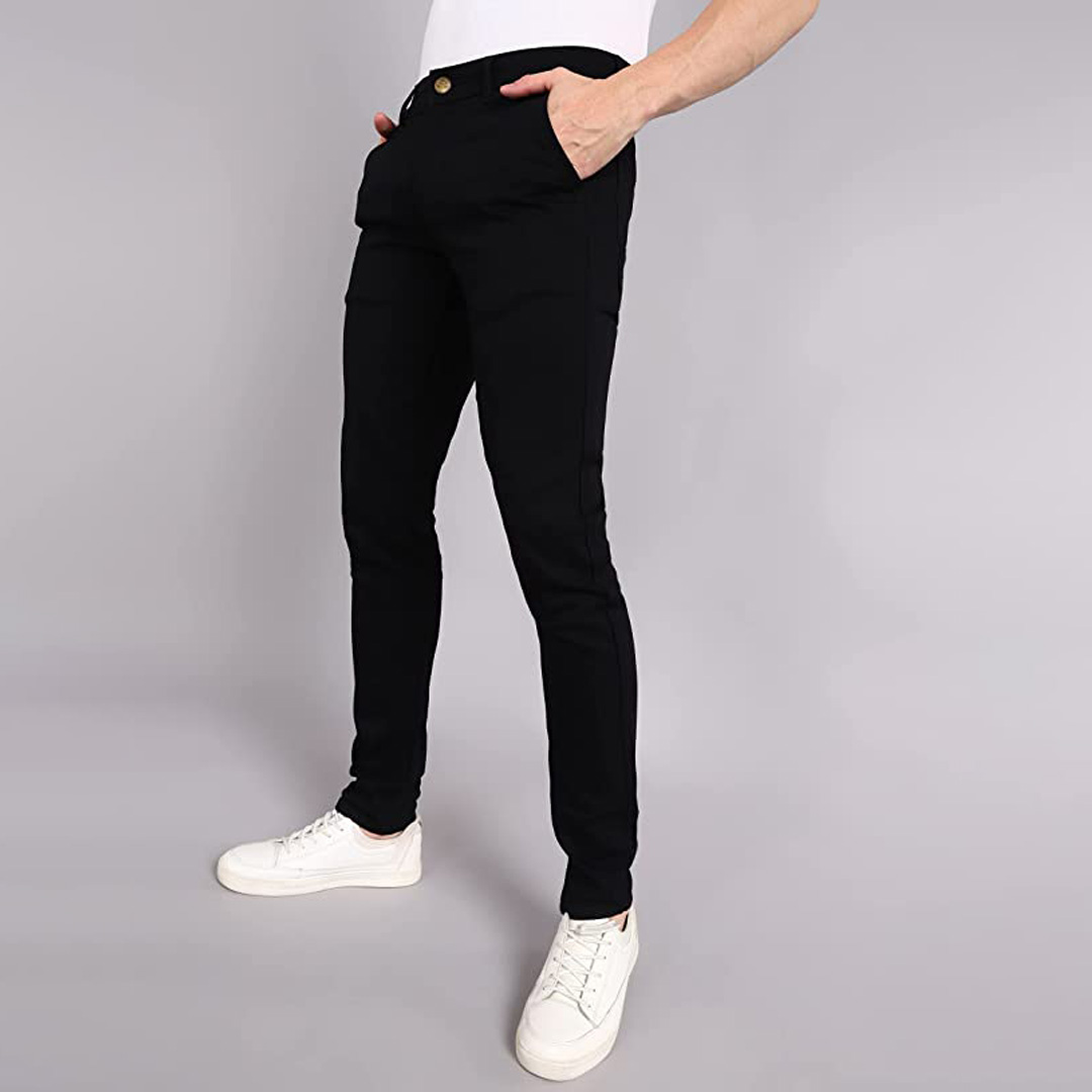 Color: Black Pockets: 4 Fit Type: Regular Fit Fabric: Cotton Lycra Fabric with Stretch Care Instructions: Mild Wash, wash separately Pattern : Solid Style Zip : Zip Fly with Button Closure