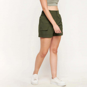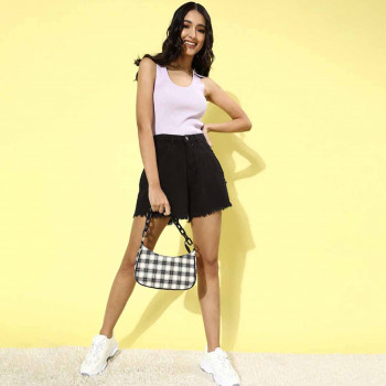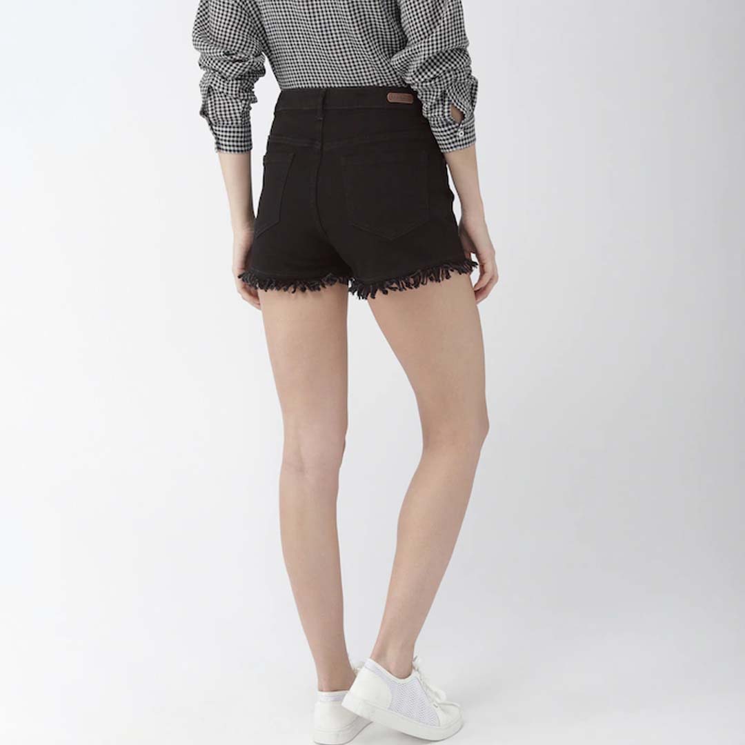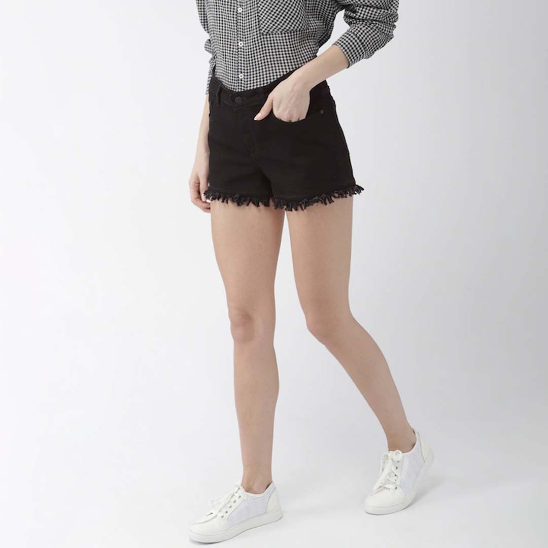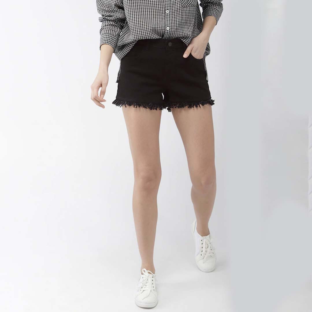 Black solid mid-rise denim shorts, has 5 pockets, button closure, raw hem
