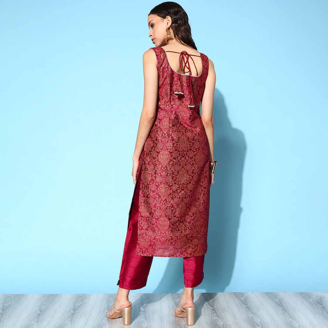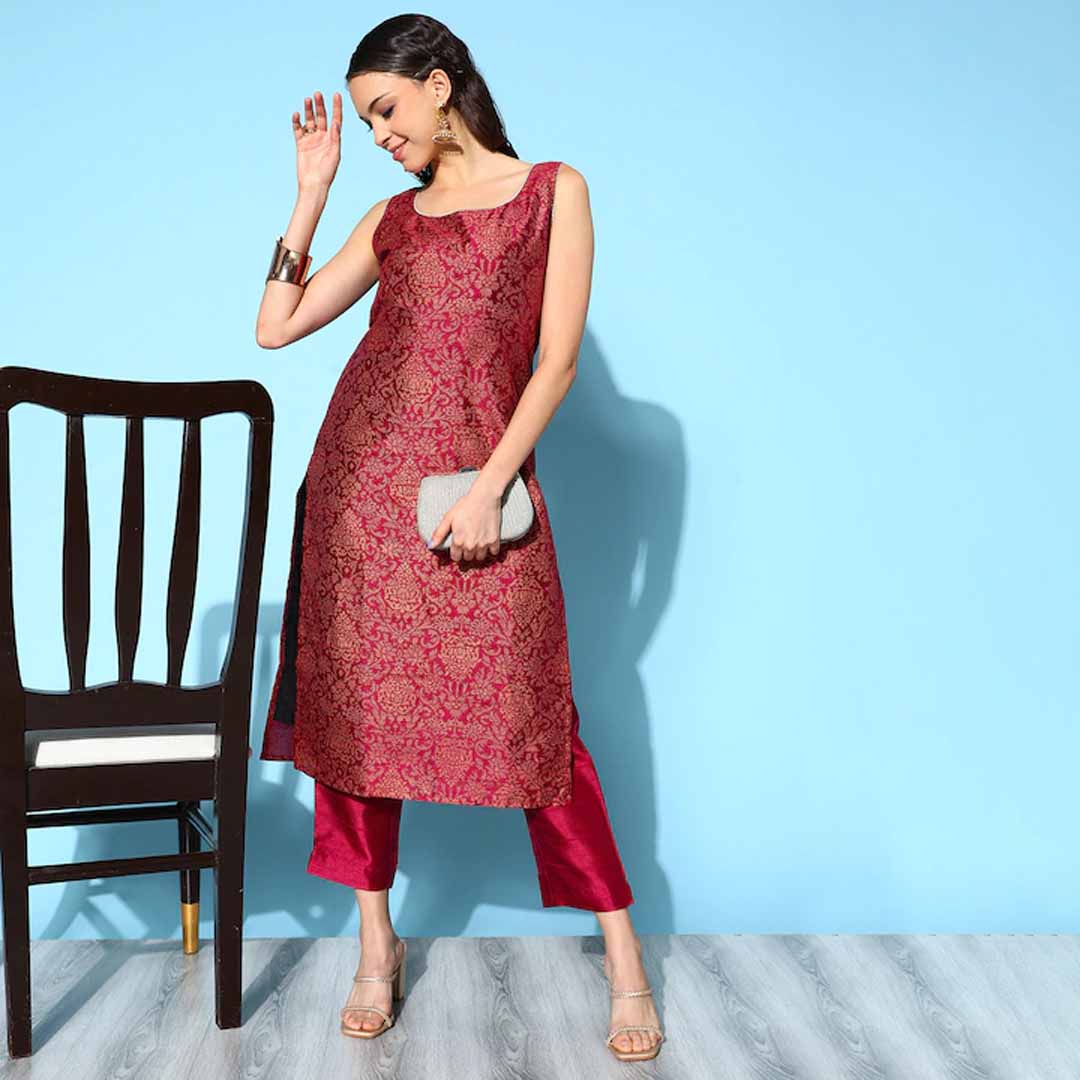 Add a touch of style to your ethnic wear closet with this smart and fashionable kurta set. It comes with a round neck and charming calf length for an elevated appeal. Kurta: Burgundy tone Round neck Sleeveless Calf length Poly silk, hand wash Trousers: Solid trousers Partially elasticated waist Poly silk, hand wash