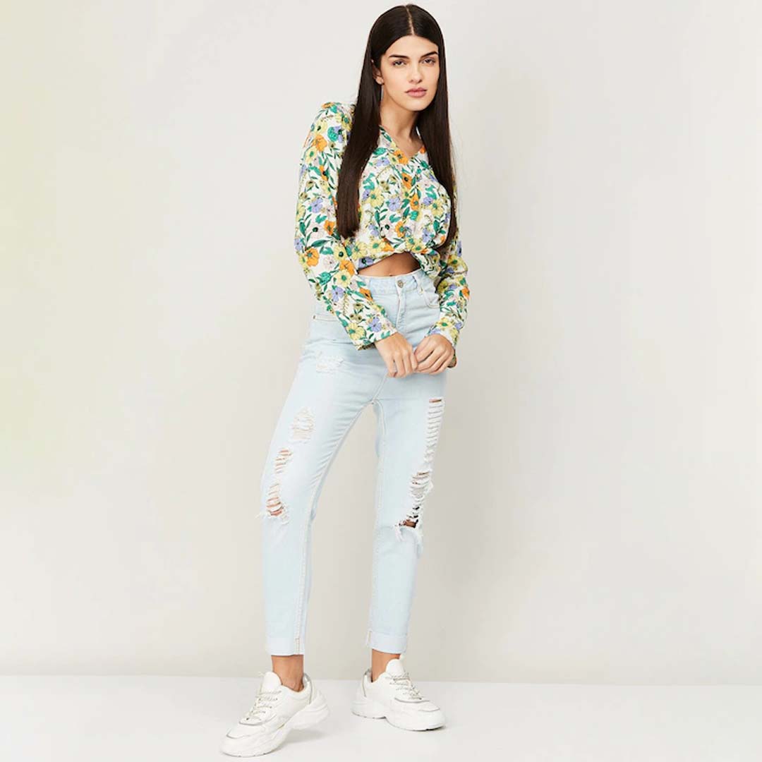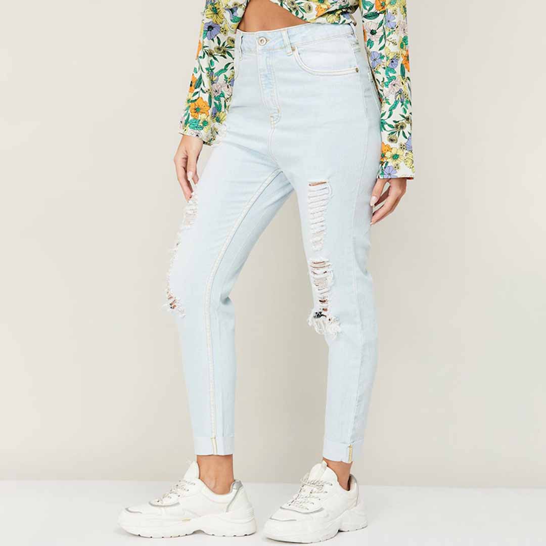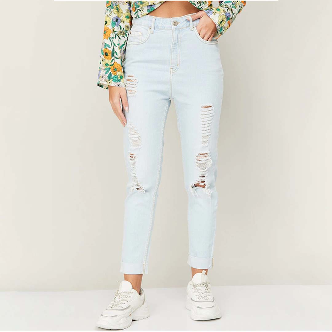 Size & Fit Slim fit, mid-rise Mildly distressed Non stretchable 5 pocket Length: cropped Fit: Slim Fit Non Stretchable The model (height 5'8) is wearing a size 28 Material & Care Material: Cotton; Machine Wash