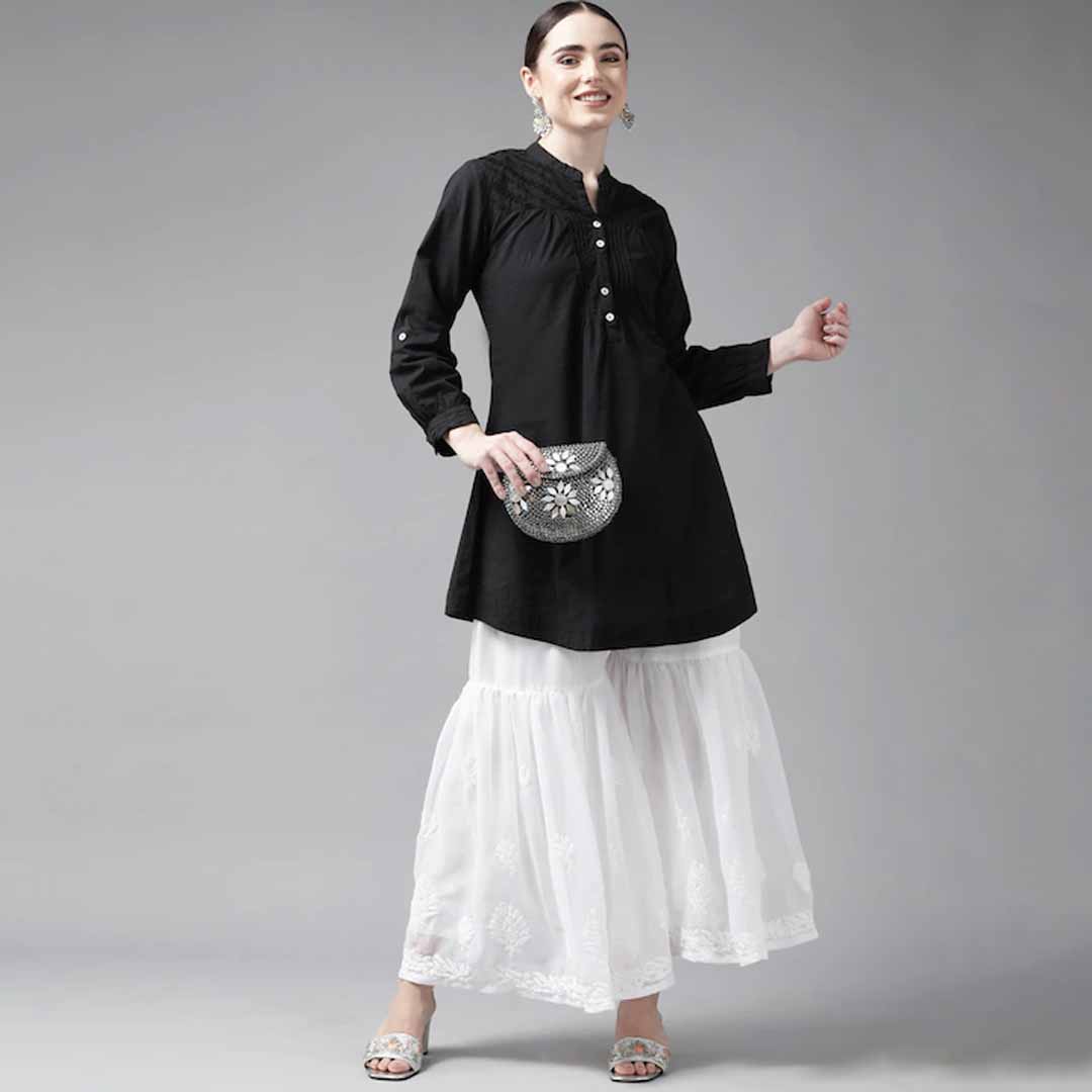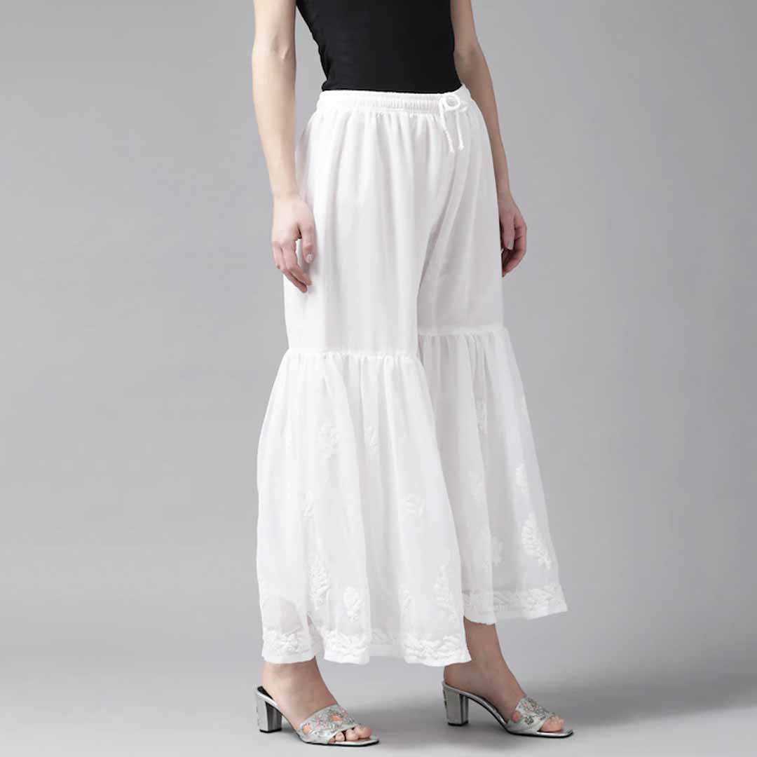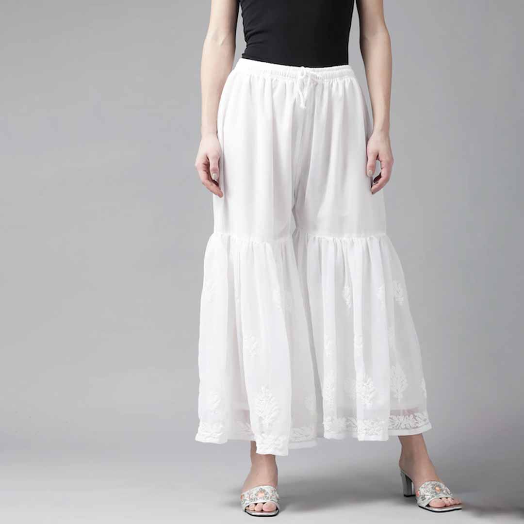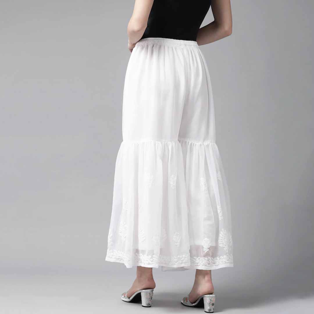 Size & Fit The model (height 5'8) is wearing a size S Ethnic motifs hand embroidered Sheer with full lining Flared fit Elasticated waistband Length: regular Handloom georgette fabric Material & Care Georgette Hand wash